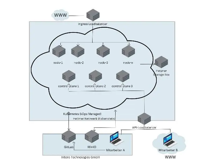 Ein weiterer Schwerpunkt war die Nutzung von Technologien wie Infrastruktur as Code und GitOps. Mithilfe dieser lässt sich die gesamte Infrastruktur sowie die Services, die im Cluster laufen sollen, eindeutig und reproduzierbar definieren. Somit ist das gesamte Cluster in Problemfällen zu Migrations- oder zu Testzwecken leicht wieder herstellbar.