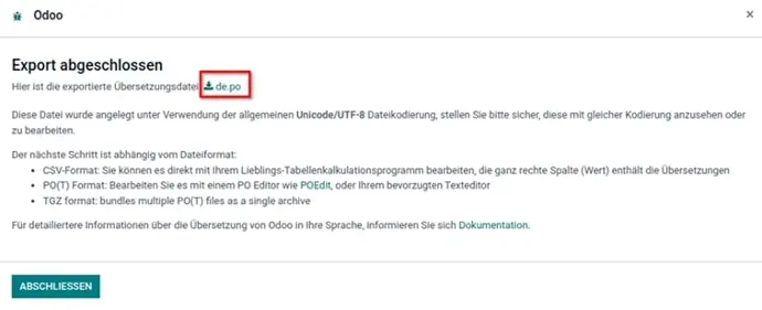 Hier können wir die Übersetzungsdatei durch einen Klick auf „de.po“ herunterladen.