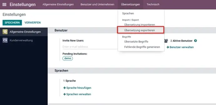 Zum Exportieren der Übersetzung muss im Debug Modus folgender Pfad genutzt werden: Einstellungen -> Übersetzungen -> Übersetzung exportieren.