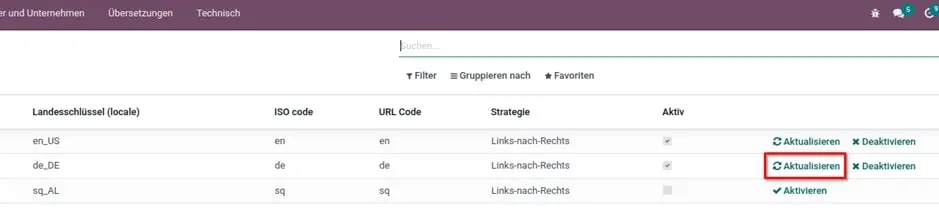 Nach einem Neustart von Odoo muss jetzt das Modul aktualisiert werden. Im Anschluss muss dann ebenfalls die Sprache aktualisiert werden. Dazu muss man unter Einstellungen -> Übersetzung -> Sprachen die Sprache auswählen und anschließend aktualisieren. Wichtig ist, dass der Haken bei „Bisherige Übersetzungen ändern“ gesetzt ist.