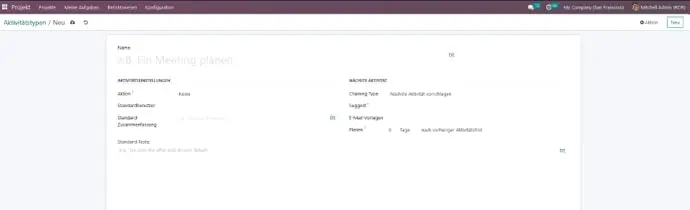 Zur Auswahl als Aktion gibt es in Odoo Standard die Folgenden: „Keine, Dokument hochladen, Anruf, Meeting und Steuerreport“.