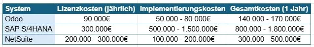 • Implementierungskosten: Diese können je nach Komplexität 500.000–1.500.000 € betragen, insbesondere bei branchenspezifischen Anpassungen.