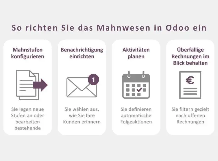 Mit Odoo machen Sie Ihr Mahnwesen schlanker. Sie automatisieren Abläufe, verbessern die Kommunikation mit Ihren Kunden und sorgen dafür, dass Rechnungen schneller bezahlt werden. Und das Beste: Sie behalten jederzeit die volle Kontrolle.