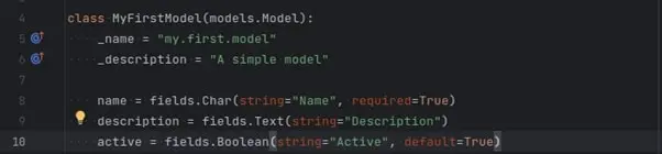 Dank der bisherigen Schritte können wir das Modul bereits installieren, jedoch würden wir noch nichts sehen. Dafür wird ein sogenanntes Modell benötigt. Modelle in Odoo repräsentieren eine Datenbanktabelle, zu diesem Modell gehören Eigenschaften und Ansichten, die der Benutzer in der Oberfläche sehen kann. Erstellen Sie dafür die Datei my_first_model.py im Ordner models mit folgendem Inhalt: