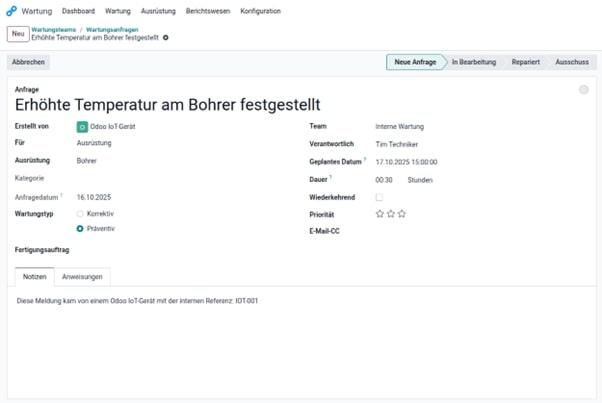 An einer Ihrer wichtigsten Produktionsanlagen ist ein Industriesensor installiert, der kritische Werte wie Vibrationen oder Temperatur überwacht. Die Anbindung über die IoT-Box sorgt dafür, dass alle Ihre Geräte die Sprache von Odoo sprechen. Sobald diese Verbindung steht, leitet die IoT-Box die Messwerte an die Odoo-App Wartung weiter. Werden definierte Grenzwerte überschritten, erstellt das System automatisch einen Wartungsauftrag für Ihr Team.